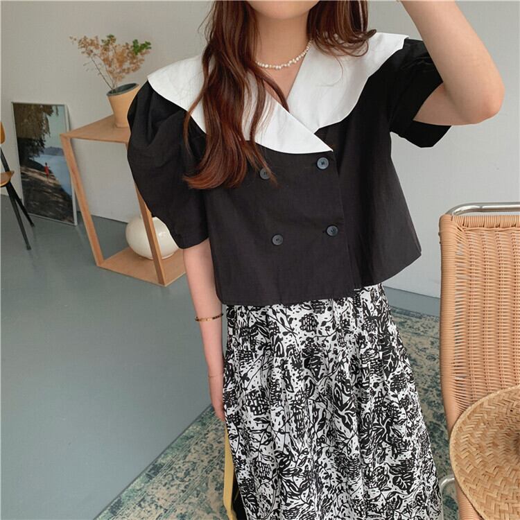 2点セット カジュアル エレガント 百掛け レトロ ダブルボタン パフスリーブ 短いスタイル シャツ