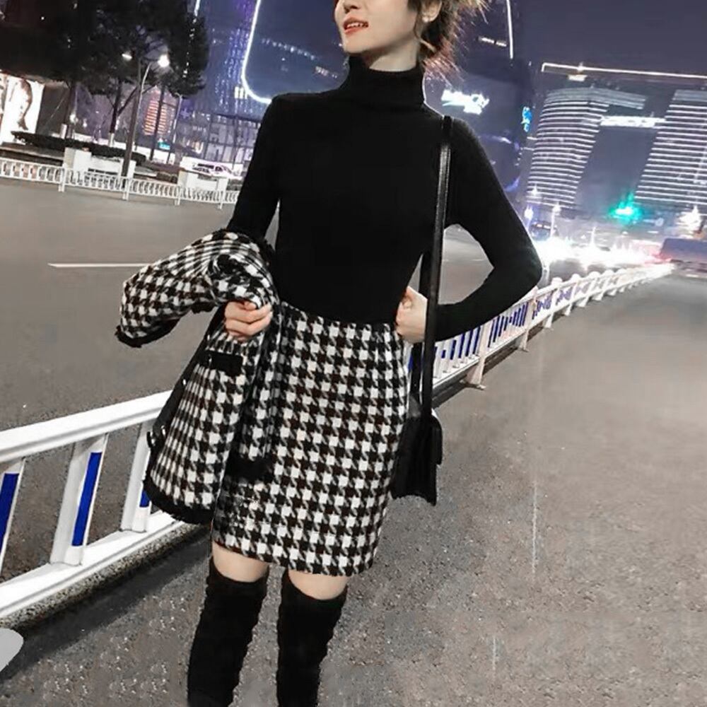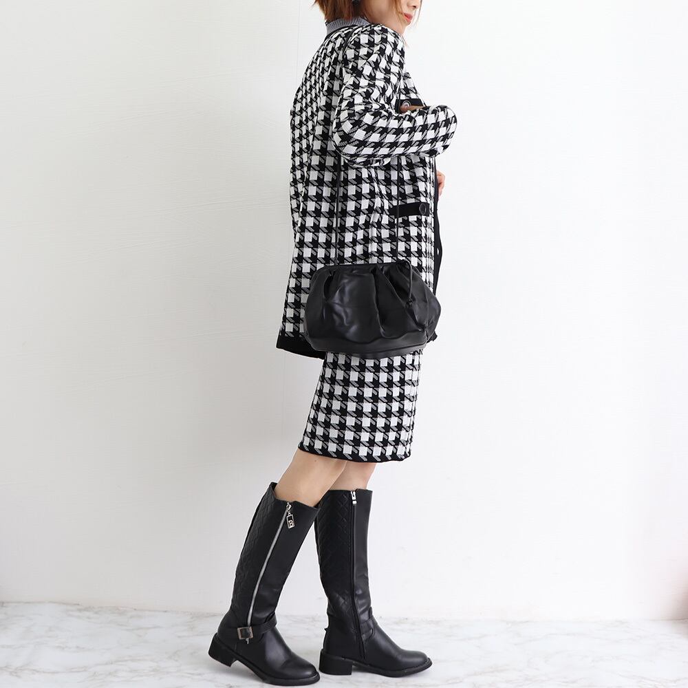 Vネックのロング丈ジャケットにミニ丈タイトスカート、モノトーンでシンプルおしゃれな千鳥柄ニット生地上下2点セット